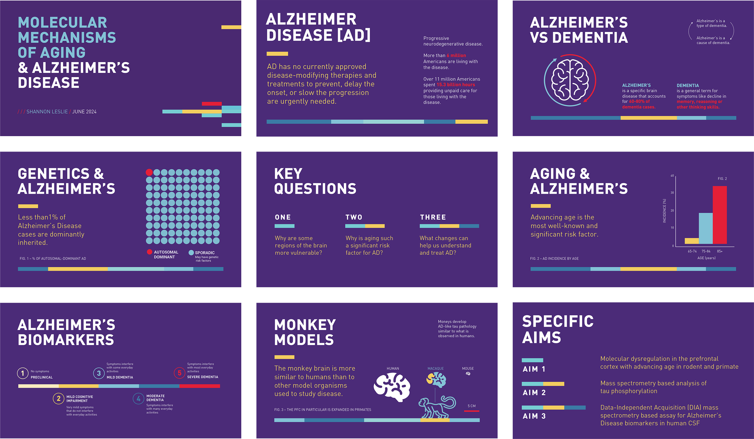 To strengthen emotional connection and reinforce brand consistency, we incorporated purple—the signature color of the Alzheimer’s Association. Subtle graphic elements inspired by protein markers helped create a visually compelling narrative grounded in scientific integrity. This custom presentation design balanced clarity and emotion, telling a story of urgency, collaboration, and hope in the search for a cure.
